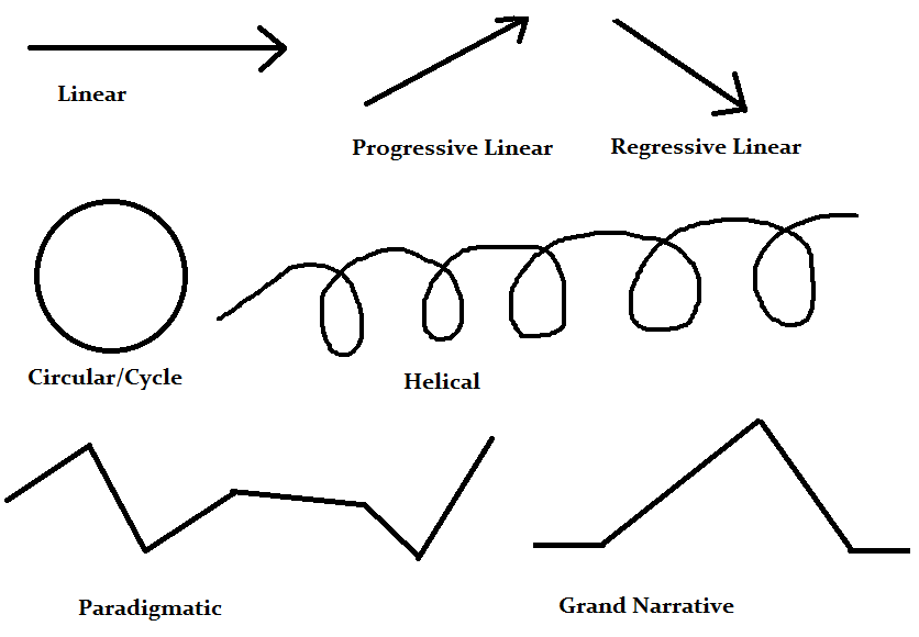 1. Circular/cycle. Traditionally, many see history in terms of cycles. Cycle of life, cycle of seasons, cycle of dynasties. This view tends to show the world as not making long-term changes. History keeps returning to its starting point.Ancient peoples commonly saw history in terms of cycle. But of course, it is not just ancient peoples. Many still do today, such as the Hindu view of history. This view is unlikely to go away. After all, some aspects of time clearly have a cyclic form to it. Birth maturation, death. revolution and rotation of the earth, seasons, phases of the moons, all have a circular aspect to them